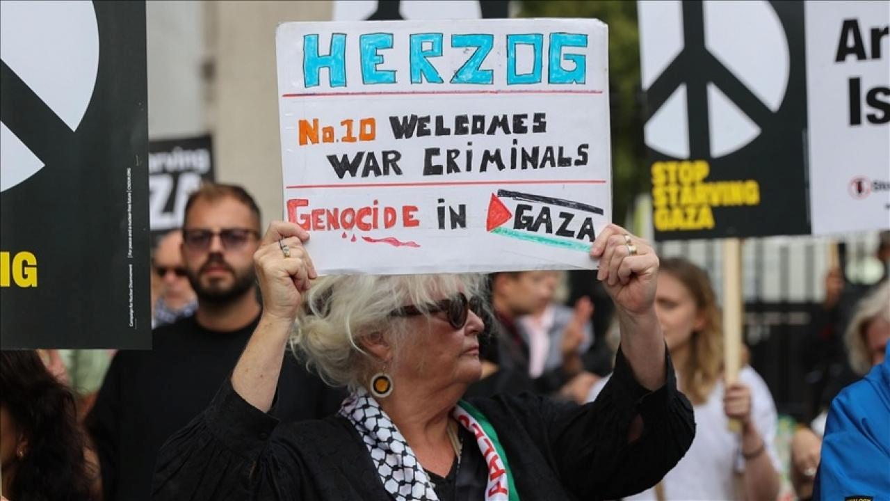 Filistin bayrakları taşıyan aksiyoncular, Herzog’u ağırlayacak olan Başbakan Keir Starmer’a da reaksiyon göstererek, “Keir Starmer saklanamazsın, soykırımla yargılanacaksın” sloganları attı.