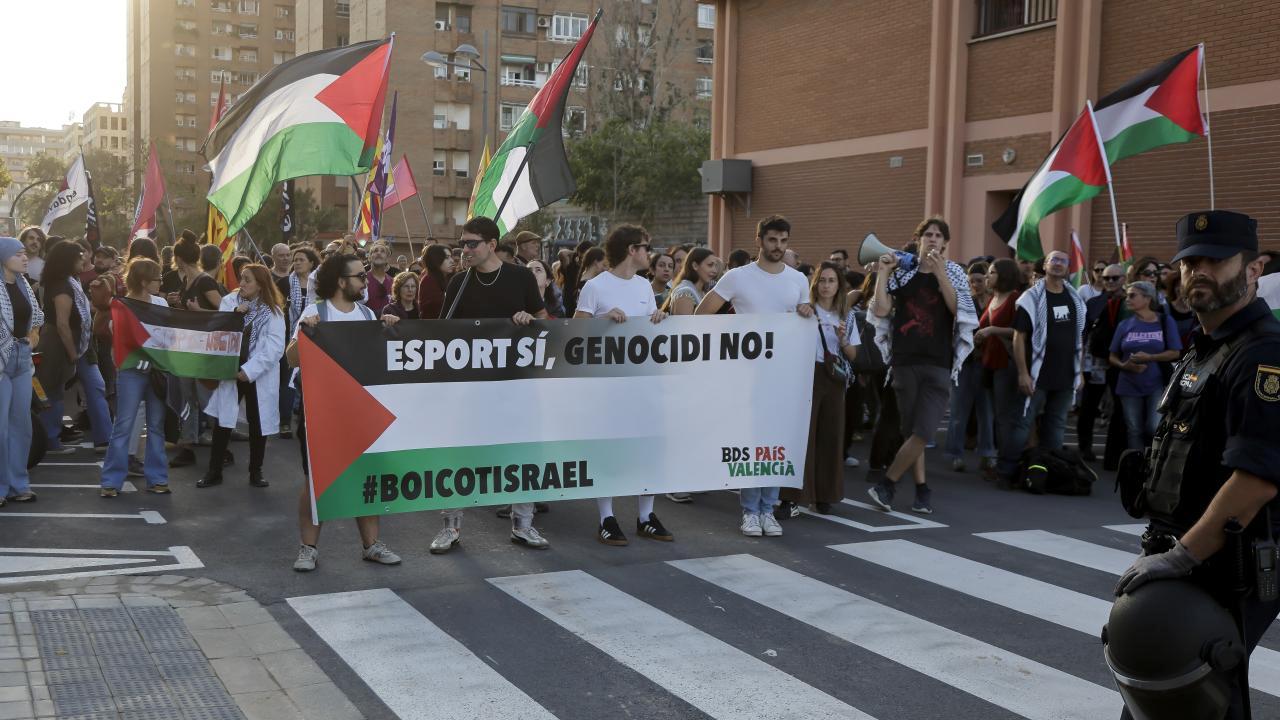 İspanya’nın Valencia kentindeki Roig Arena önünde, EuroLeague kapsamında oynanan Valencia Basket ile Hapoel Tel Aviv müsabakası öncesinde Filistin halkına takviye gösterisi düzenlendi.