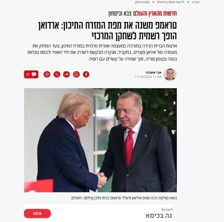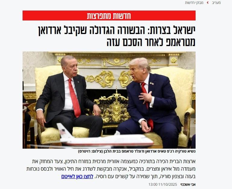 İsrail’in en büyük gazetelerinden biri olan Maariv, “İsrail’in başı belada: Gazze mutabakatının akabinde Erdoğan’ın Trump’tan aldığı büyük haber” başlıklı tahlilinde, Amerika Birleşik Devletleri’nin Türkiye’yi ‘Orta Doğu’nun merkezi bölgesel gücü’ olarak tanıdığını belirtti ve bu durumun Ankara’nın pozisyonunu daha da güçlendirdiğini yazdı.