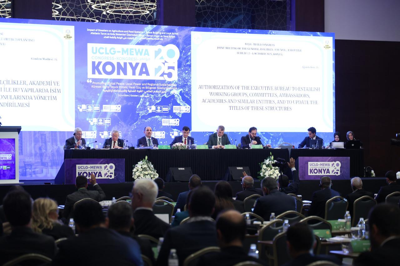 UCLG-MEWA Kongresi kapsamında düzenlenen Genel Kurul’u yöneten UCLG ve Konya Büyükşehir Belediye Başkanı Uğur İbrahim Altay, El-Halil Belediye Lideri Tayseer Abu Sneineh’in yeni devir başkanlığını genel konseyin oylarına sundu.