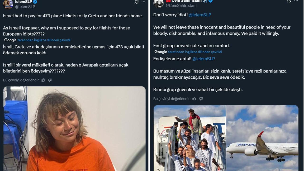 X’te (twitter) İsrail yanlısı hesaplar tarafından Greta Thunberg’in fotoğrafı paylaşılarak Sumud filosuna katılan aktivistlerin uçak biletleri fiyatlarını tartışma konusu yapıldı. Paylaşımlarda, “İsrail, Greta ve arkadaşlarının memleketlerine uçması için 473 uçak bileti ödemek zorunda kaldı. İsrailli bir vergi mükellefi olarak neden o Avrupalı aptalların uçak biletlerini ben ödeyim?” denildi.