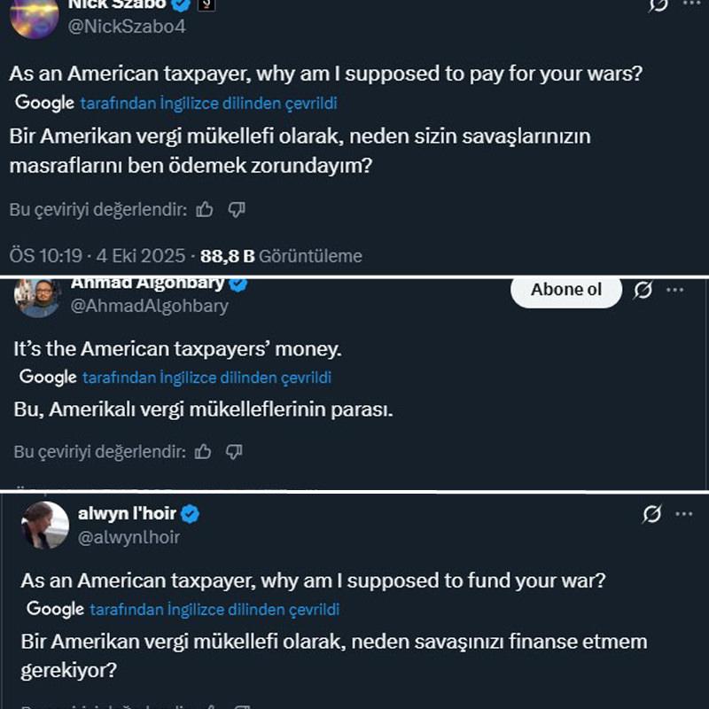 Amerikalı ve İsrailli toplumsal medya kullanıcıları X üzerinden birbirine girdi. ABD’li hesaplar, “O masrafları siz değil, biz ödüyoruz”, “Amerikalı bir vergi mükellefi olarak neden sizin savaşınızı benim finanse etmem gerekiyor” şeklinde sert cevaplar verdi.
