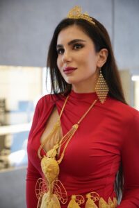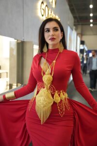Özellikle Gold Royal firmasına ait, ince işçilikle hazırlanmış gösterişli altın kemerle sergilediği performans büyük ilgi gördü. Işıltılı tasarım, Ayşe Arma’nın zarif ve iddialı duruşuyla birleşince ortaya unutulmaz bir görsel şölen çıktı. Defile boyunca gözler ondan bir an bile ayrılmadı.