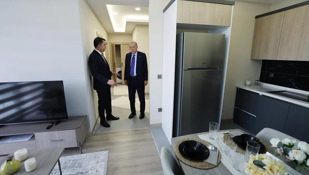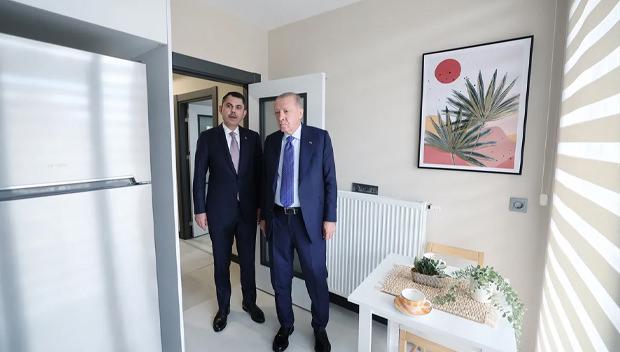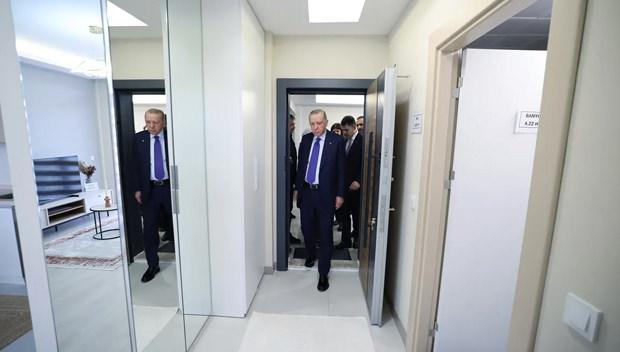 Cumhurbaşkanı Recep Tayyip Erdoğan, Etraf, Şehircilik ve İklim Değişikliği Bakanı Murat Kurum ile birlikte vatandaşlara teslim edilecek örnek daireyi inceledi.
