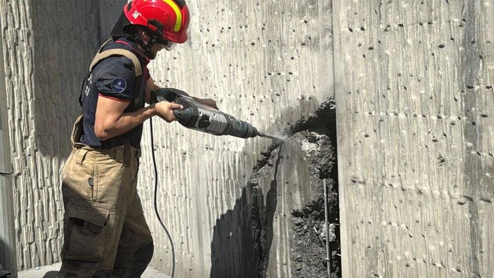 Kişinin bulunduğu yerden çıkarılması için itfaiye grupları, darbeli matkapla duvarı delmeye başladı.