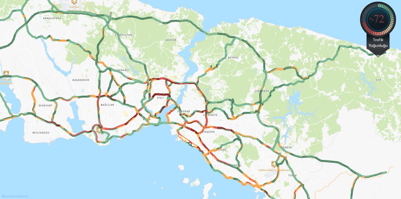 İstanbul Büyükşehir Belediyesi (İBB) Cep Trafik uygulaması datalarına nazaran, saat 17.10 prestijiyle kentteki trafik yoğunluğu yüzde 72 olarak ölçüldü.