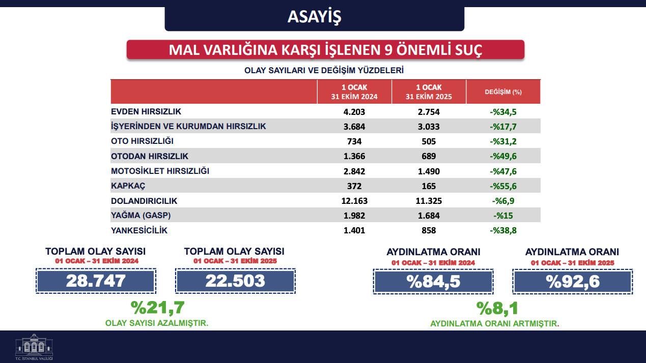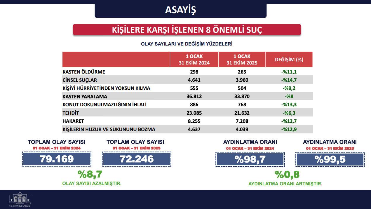 İstanbul Valiliği, 2025 yılının Kasım ayında gerçekleştirdiği Medya Buluşması‘nda, kentin 1 Ocak – 31 Ekim tarihleri ortasındaki 10 aylık emniyet datalarını kamuoyu ile paylaştı. Valilik tarafından yapılan açıklamada, “İstanbul’umuzun güvenliği, vatandaşlarımızın huzuru en büyük gayemiz” bildirisi verilirken, kentteki toplam olay sayılarında değerli bir düşüş yaşandığı ve kabahat örgütlerine yönelik çabada rekor artışlar kaydedildiği belirtildi.