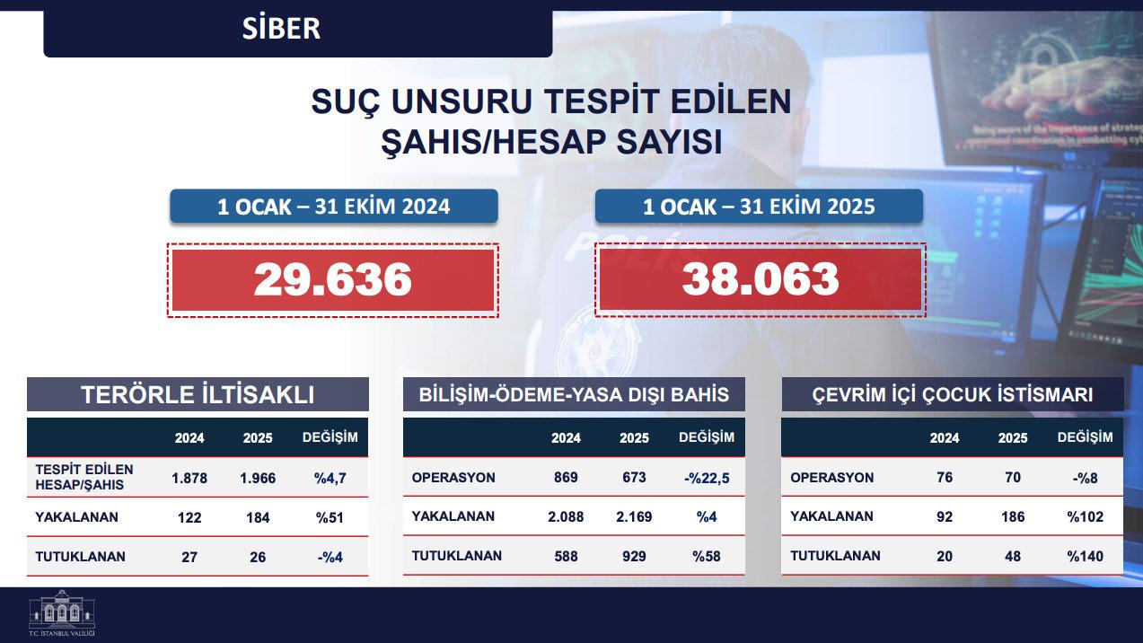 Siber cürüm alanında terörle iltisaklı hesap tespitleri, yasa dışı bahis ve çevrim içi çocuk istismarına yönelik yakalama ve tutuklamalarda artış kaydedildi. Çevrim içi çocuk istismarında yakalananlar yüzde 102 arttı. Siberde toplam kabahat ögesi tespit edilen hesap/şahıs sayısı 38 bin 63’e yükseldi.