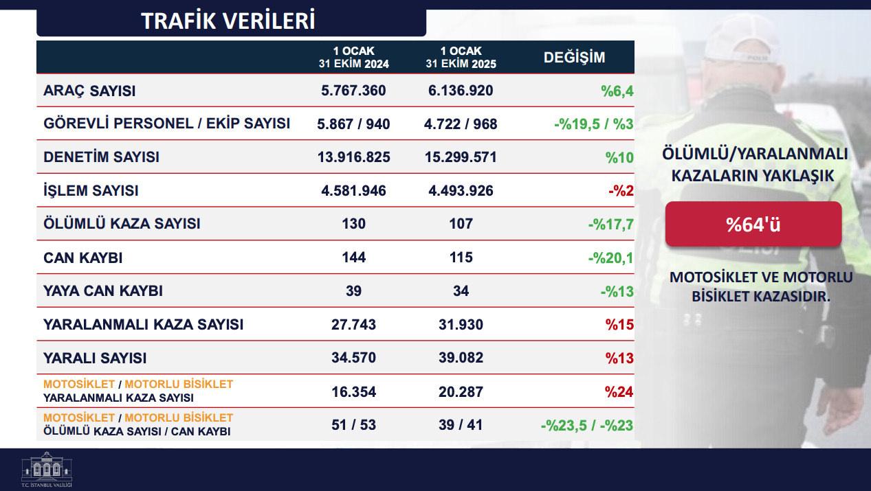Yaya can kaybı da yüzde 13 azaldı. Motorlu bisiklet ve motosikletlerin kazalardaki yükü dikkat çekti. İstanbul’daki ölümlü-yaralanmalı kazaların yüzde 64’ü motosiklet/motorlu bisiklet kaynaklı oldu.