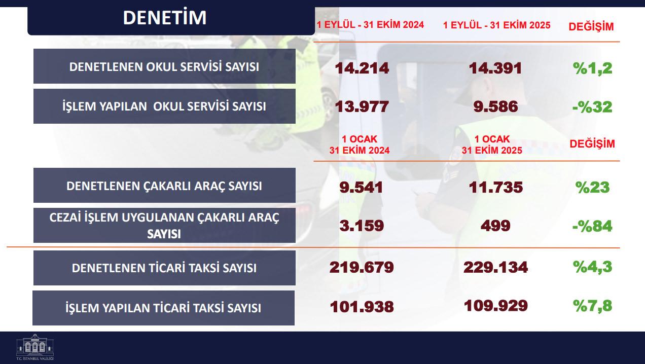 Çakarlı araç kontrolleri 2025’in birinci 10 ayında artarken, uygunsuz çakar kullanımına uygulanan cezai süreç sayısı yüzde 84 düştü. Ticari taksilerde yapılan kontrollerde süreç yapılan araç sayısı arttı. Okul servisleri için yapılan son iki aylık kontrolde ise süreç yapılan servis oranı yüzde 32 azaldı.