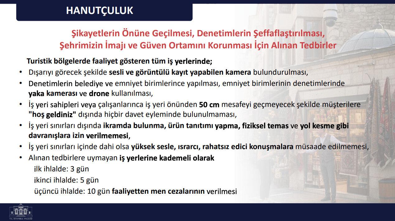 Turistik alanlarda son periyotta artan hanutçuluk şikayetlerinin akabinde yeni bir kontrol modeli devreye alındı. İş yerlerinde dışarıya dönük kamera zaruriliği getirildi, kontrollerde yaka kamerası ve drone kullanılmaya başlandı. Müşteri daveti için 50 santimetrelik hudut çizildi; hudut dışına taşan, ısrarcı ve rahatsız edici davranışlara kademeli olarak 3, 5 ve 10 gün faaliyetten men cezası uygulanacağı açıklandı.