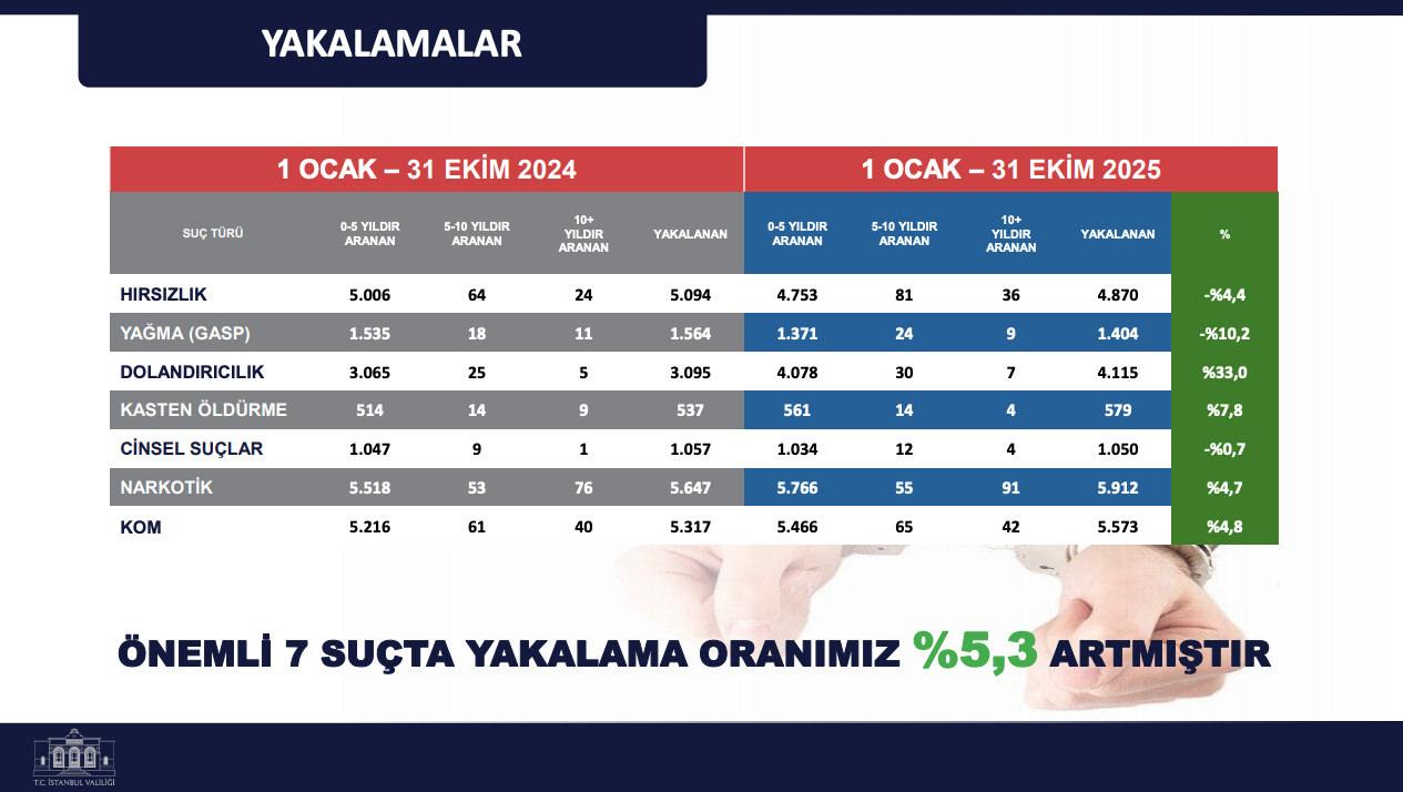 Önemli 7 cürüm kategorisinde aranan 23 bin 503 kişi yakalandı. Yakalama oranı yüzde 5,3 arttı. Kimi hata cinslerinde artış da görüldü. Örneğin dolandırıcılıktan arananların yakalanmasında yüzde 33 yükseliş kaydedildi.