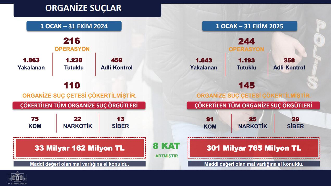 Organize kabahat çetelerine yönelik operasyonlarda çökertilen çete sayısı yüzde 33 artarak 244’e çıktı. 301 milyar 765 milyon TL pahasında mal varlığına el konuldu. Geçen yıl tıpkı devirde bu sayı 33 milyar TL’ydi. El koymada 8 kat artış yaşandı.