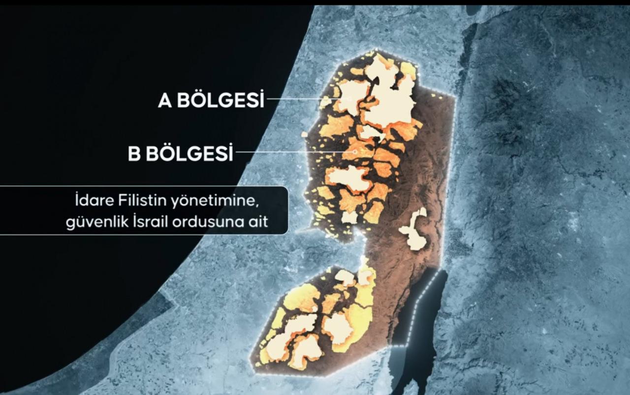 Bugünün Batı Şeria haritası, İsrail’in Filistin Yönetimi’nin denetimindeki bütün büyük kentleri küçülterek yerleşim yerleri, ileri karakollar ve yan yollarla çevrelediğini gösteriyor. Filistin kentlerinin, birbirinden büsbütün izole edilmiş adalar haline getirildiği görülüyor.