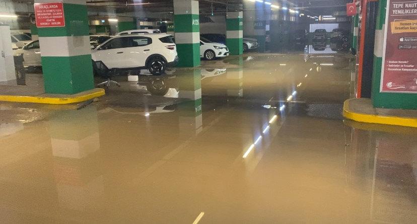 Patlayan borudan taşan su kısa müddette yolu kaplarken, olayın yaşandığı yerde bulunan AVM otoparkı adeta dereye döndü.
