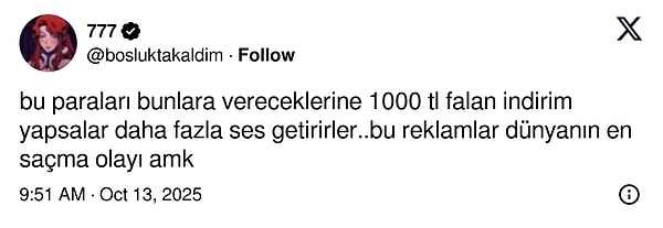 Kimi “Bu paraları bunlara vereceklerine 1000 TL indirim yapsalar daha fazla ses getirirler.” derken, kimi de “Bu reklamlar dünyanın en saçma olayı, kimse artık ünlü görünce alışveriş yapmıyor.” yorumunda bulundu.