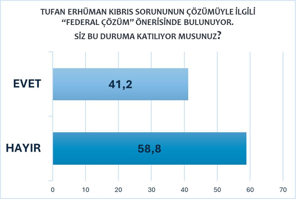 Araştırmalar sonucunda KKTC halkının çoğunluğunun iki devletli tahlilden yana tercihini ortaya koyduğunu tabir eden Aktaş, “UBP, iki devletli tahlili savunurken; CTP daha çok federasyondan yana bir tutum sergilemektedir. Kıbrıs seçimlerinde Cumhurbaşkanı adayı olan Ersin Tatar ve Tufan Erhürman için halka iki soru sorduk. Ersin Tatar, Kıbrıs’ın geleceği için iki devletli tahlili savunmaktadır. “Bunu destekliyor musunuz?” sorusuna seçmenin yüzde 58,9’u “Evet” cevabını vermiştir. yüzde 41,1’lik bir kesim ise federasyonu desteklemektedir.” formunda konuştu.