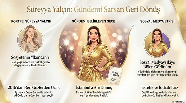 İstanbul geceleri bazen tek bir isimle tekrar hareketlenebiliyor. Uzun vakittir gözlerden uzak bir hayat süren Süreyya Yalçın, ABD’den tatil için geldiği İstanbul’da eşi Ozan Baran’la bir davette görüntülenince toplumsal medya tekrar ikiye bölündü. 2. sayfa’dan Okan Mermer’in kadrajına yakalanan isim hem yüzündeki değişim ve estetik yorumları hem de altın tonlarındaki savlı usulü, “yıllar sonra birinci defa bu kadar net gördük” diyenlerin radarına girdi.