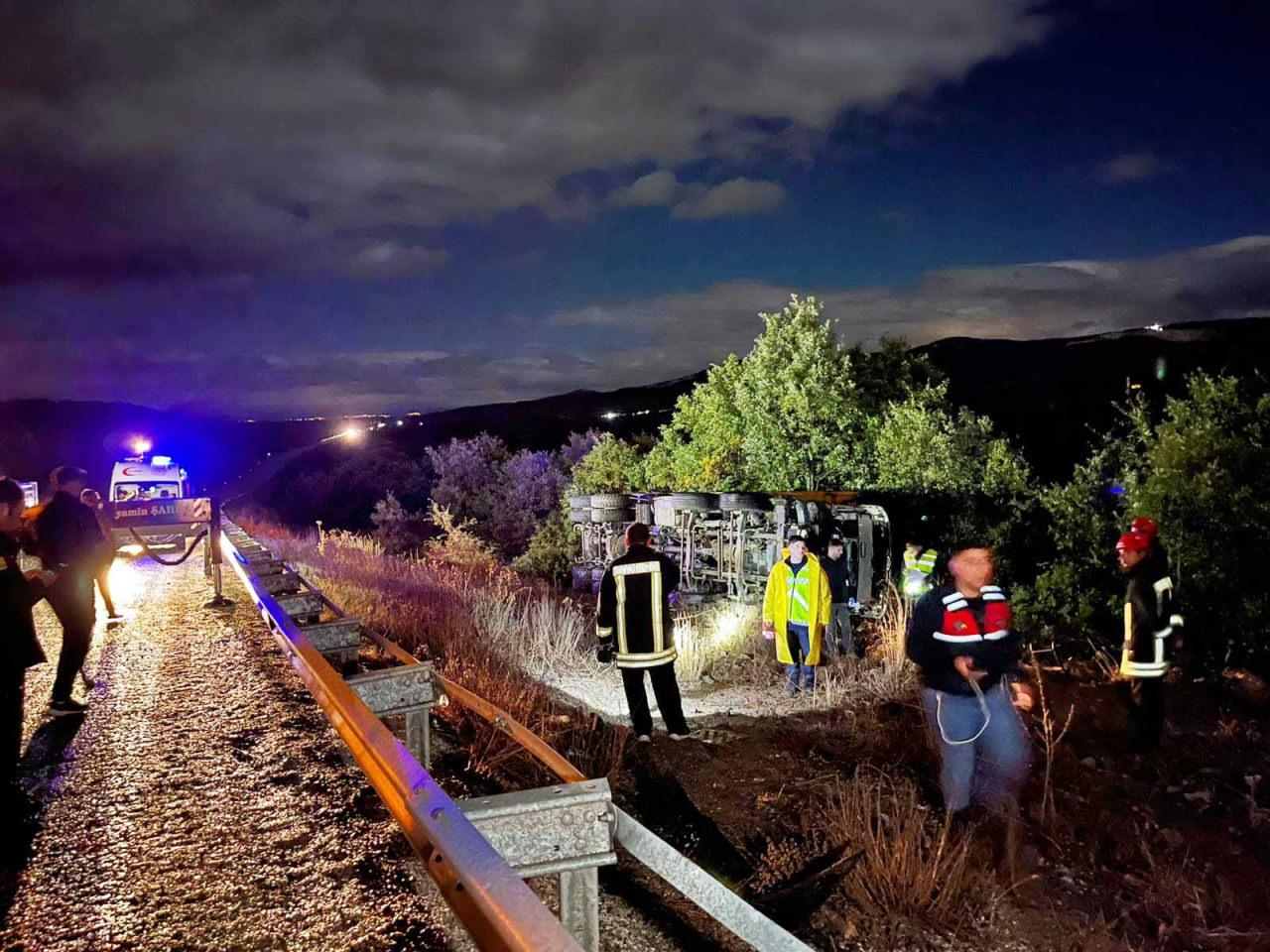 Mustafa Topbaş’ın (41) direksiyon denetimini kaybettiği 06 BYE 856 plakalı kamyon, refüje çarpıp devrildi. İhbar üzerine kaza yerine polis, jandarma, itfaiye ve sıhhat takımı sevk edildi. Takımlar şoför Mustafa Topbaş ve yanındaki Murat Yılmaz’ın öldüğünü belirledi.