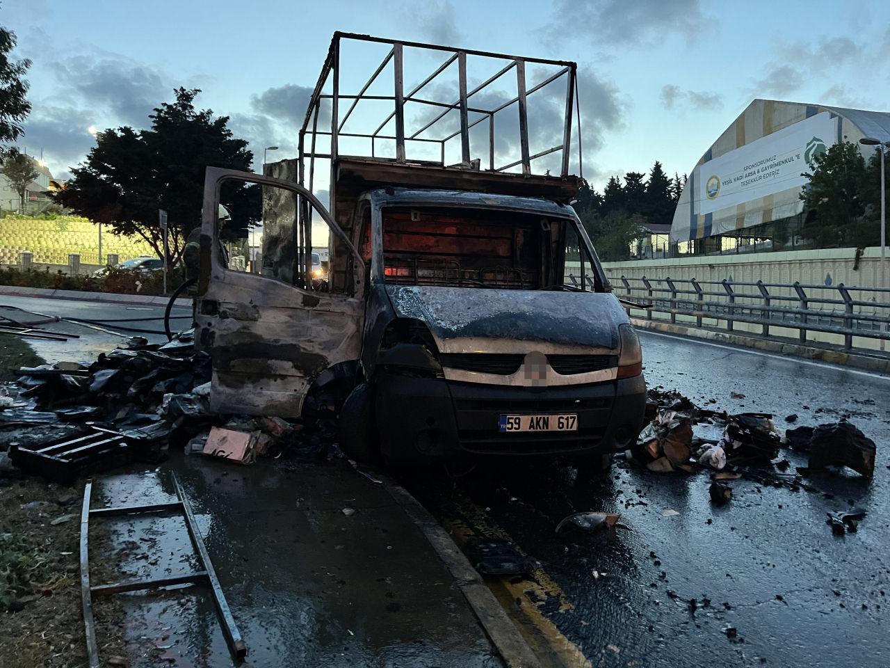 İtfaiye takımları, alevler içinde kalan kamyonete müdahale ederek yangını söndürdü.