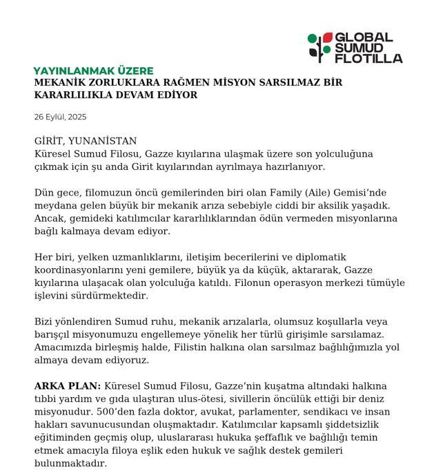 Aktivistleri yönlendiren Sumud ruhu, mekanik arızalarla, olumsuz şartlarla yahut barışçıl misyonunu engellemeye yönelik her türlü teşebbüsü kararlılıkla aştı. Hedefimizde birleşmiş halde, Filistin halkına olan sarsılmaz bağlılığımızla yol almaya devam ediyoruz.”