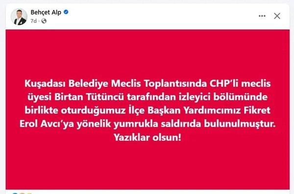 Olay, meclis toplantısı sırasında izleyici bölümünde yaşandı. İYİ Parti Kuşadası İlçe Lideri Behçet Alp, toplumsal medya hesabından yaptığı açıklamada saldırıyı kınadı. Alp paylaşımında şu tabirleri kullandı: “Kuşadası Belediye Meclis Toplantısında CHP’li meclis üyesi Birtan Tütüncü tarafından, izleyici kısmında birlikte oturduğumuz İlçe Lider Yardımcımız Fikret Erol Avcı’ya yönelik yumrukla hücumda bulunulmuştur. Yazıklar olsun!”