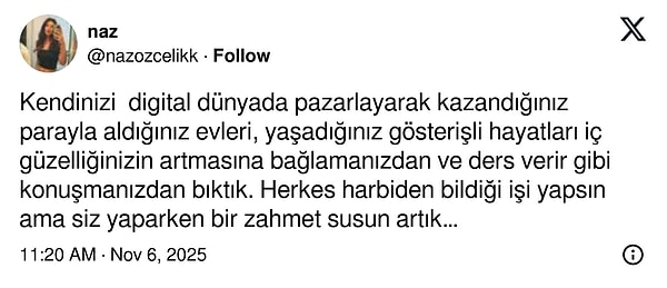 O paylaşımın altına ‘Allah’ıma şükürler olsun, bana bu türlü bir konutta oturmayı nasip ettiği için. İç güzelliğiniz arttıkça dışarıda da daha çok hoşluklara şahitlik ettirileceksiniz. Her geçen gün ruhumuzu, kalbimizi, zihnimizi berbatlıktan, nefretten, yargıdan, öfkeden, kıskançlıktan arındırmaya çalışmamız gerekiyor.’ tabirlerini düşen isim reaksiyon çekti.