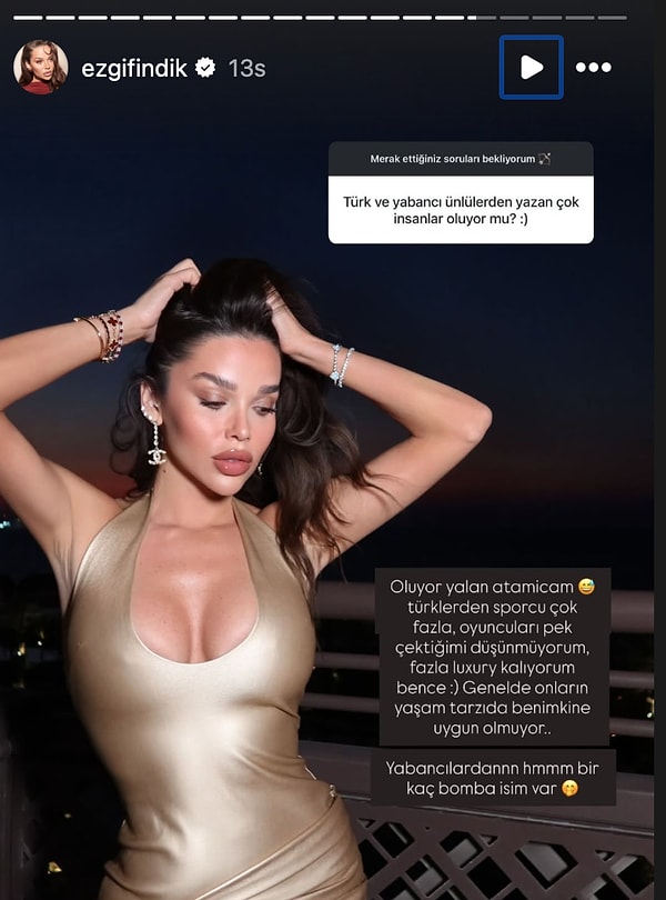 Ezgi Fındık, dün akşam Instagram’da yaptığı soru–cevap serisiyle tekrar toplumsal medyanın odağına yerleşti. Takipçilerinden gelen soruları yanıtlayan Fındık, bilhassa “Türk ve yabancı ünlülerden sana yazan çok oluyor mu?” sorusuna verdiği yanıtla gündeme oturdu. Kendisine bildiri atan isimler ortasında özellikle Türk sporcuların öne çıktığını, oyunculardan ise pek hoşlanmadığını ima etti.