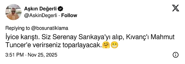 Hayrettin’in kendisine ‘Hayatın bir sinema olsa kimin oynamasını isterdin?’ diye sorması üzerine bir düşünen, düşündükten sonra da ‘Bir kaya vardı, Sarıkaya mı?’ karşılığını verdi. Bahsettiği kişinin Serenay Sarıkaya olduğunu anlayan Hayrettin ve izleyici gülmeye başladığındaysa sonlandı; ‘Niye? Oynayamaz mı canım? Ne bakıyorsunuz o denli? Oynayabilir. Onda rol kabiliyeti var. Bir ufak makyajdır, şudur budur, olur’ açıklamasında bulundu.