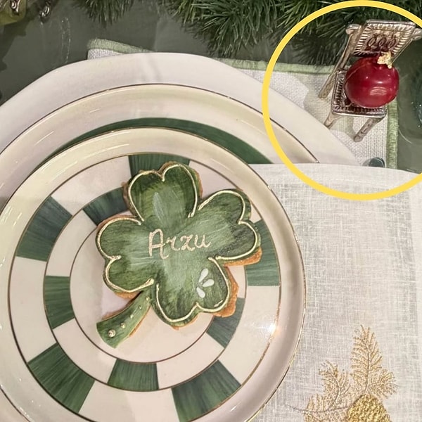 Normalde süslenmesine alışık olduğumuz narı bu sefer sandalyede gördük! Bu yılın teması ‘şans’ sanıyoruz, bu sefer isimler, dört yapraklı yoncaların içine gold ayrıntılarla yazılmıştı.
