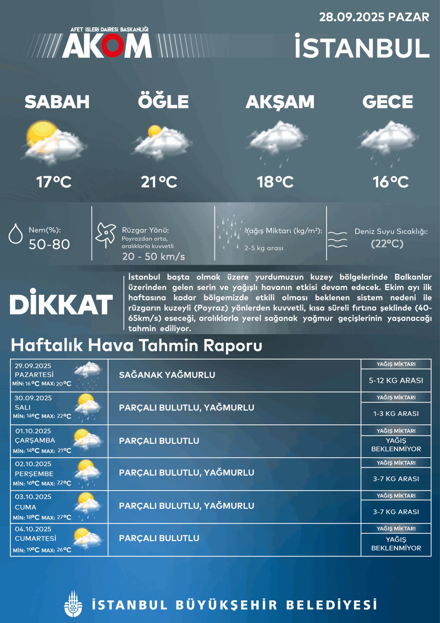 Afet Daire İşleri Başkanlığı, balkanlar üzerinden serin ve yağışlı havanın geldiğini duyurdu. Ekim ayının birinci haftasına kadar bölgede tesirli olması beklenen sistem nedeni ile rüzgarın kuzeyden kuvvetli (40-65 km/s) halde esmeye devam edeceği belirtilirken, aralıklarla mahallî sağanak yağmurun yaşanacağı duyuruldu.