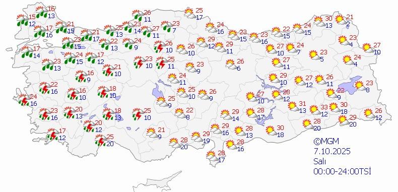 Meteoroloji Genel Müdürlüğü tarafından yapılan iddialara nazaran: Yurdun kuzey ve batı bölümlerinin kesimli, yer yer çok bulutlu, Marmara’nın batısı ve Kıyı Ege ile Kocaeli, Yalova ve Bursa etraflarının sağanak ve yer yer gökgürültülü yağışlı, öteki yerlerin az bulutlu ve açık geçeceği varsayım ediliyor. Yağışların akşam saatlerinden sonra Marmara’nın batısı ile Kuzey Ege kıyılarında lokal kuvvetli olması bekleniyor.
