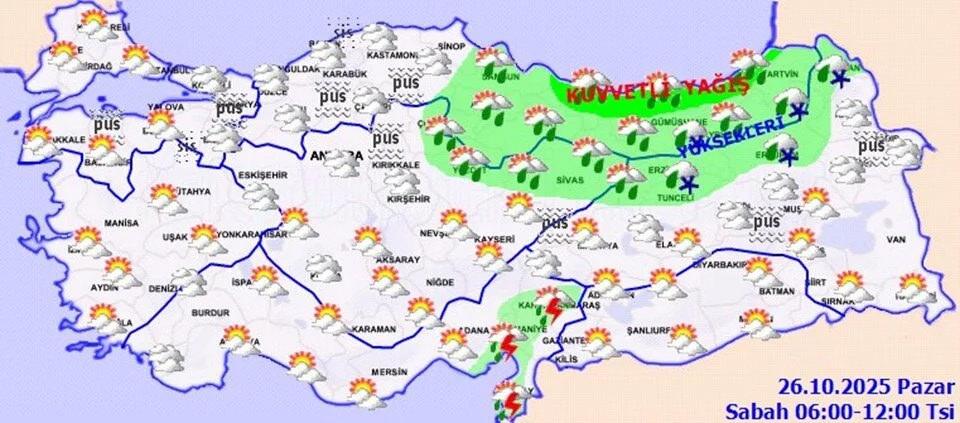 Meteoroloji Genel Müdürlüğü (MGM) Doğu Anadolu’nun kuzeydoğusuna yüksek kısımlarda kar ve karla karışık yağmur; Doğu Karadeniz’de kuvvetli yağış beklendiğini duyurdu.