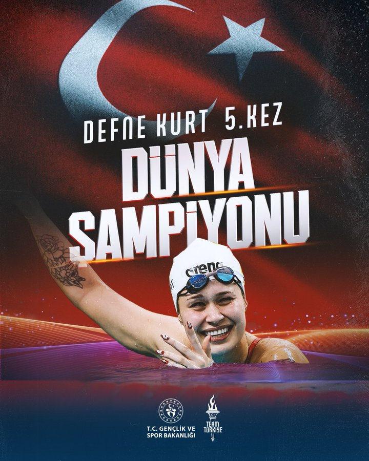 Daha evvel 50m ve 100m hür tarz, 100m kelebek ve 200m kişisel karışıkta dört altın madalya kazanan Defne Kurt, dünya şampiyonasını 5 altın madalya ile tamamlayarak tarihi bir muvaffakiyete imza attı.