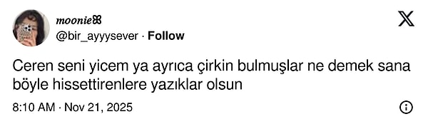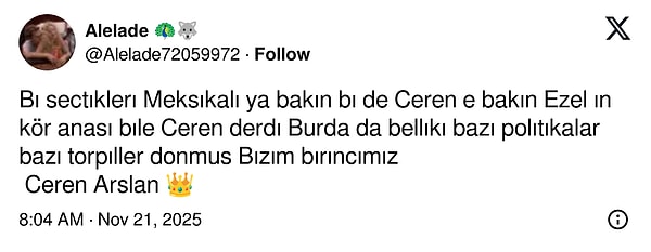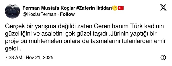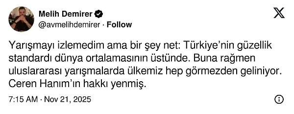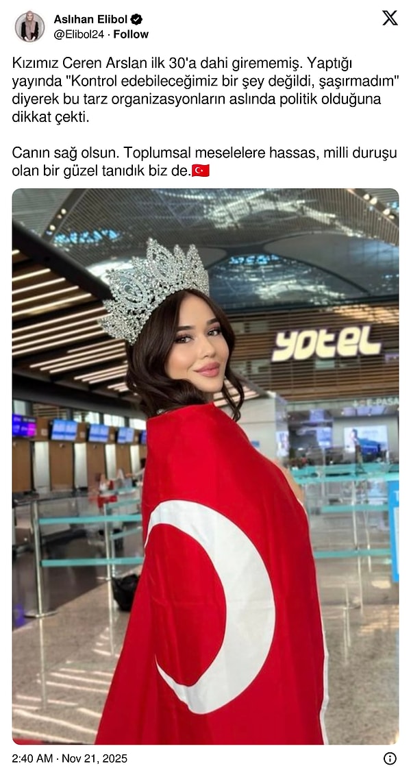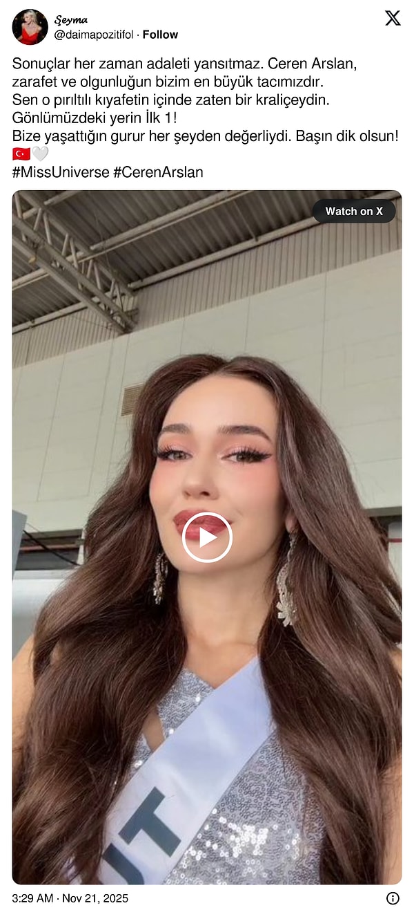 Miss Universe 2025 müsabakasının sonuçları açıklanır açıklanmaz toplumsal medya adeta alev aldı. Meksika hoşu Fatima Bosch’un birincilik tacını takmasının akabinde gözler Türkiye’yi temsil eden Ceren Arslan’a çevrildi. Lakin Arslan’ın yarışta birinci 30’a dahi sokulmaması, herkesi şaşkına çevirdi. Toplumsal medya hesabından açıklama yapan ve hislerini lisana getiren temsilcimize dayanak bildirileri yağdı.
