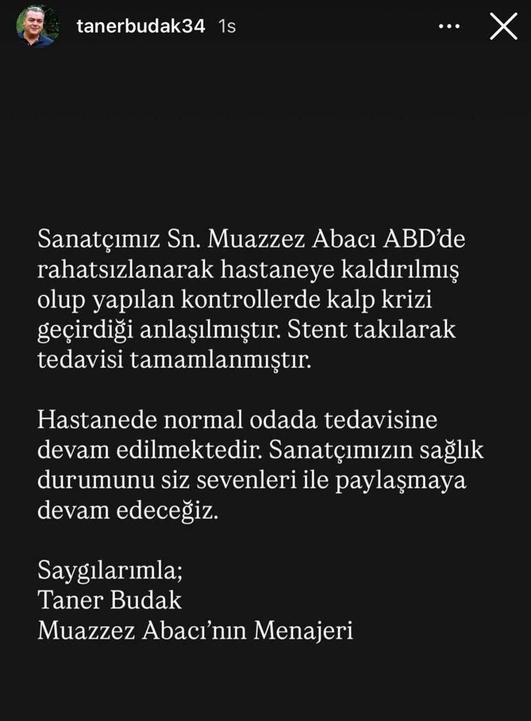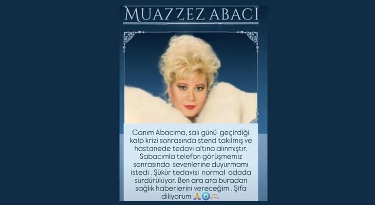 ”Sanatçımız Sn. Muazzez Abacı ABD’de rahatsızlanarak hastaneye kaldırılmış olup yapılan denetimlerde kalp krizi geçirdiği anlaşılmıştır. Stent takılarak tedavisi tamamlanmıştır. Hastanede olağan odada tedavisine devam edilmektedir. Sanatkarımızın sıhhat durumunu siz sevenleri ile paylaşmaya devam edeceğiz.”