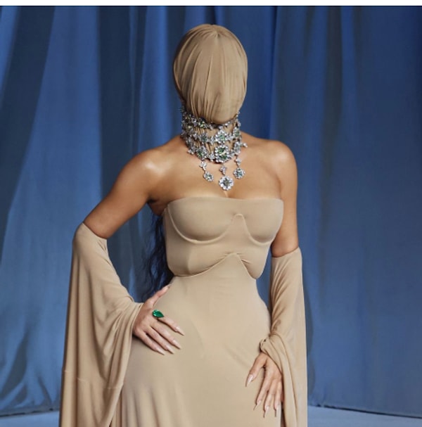Kim Kardashian, gala gecesine Maison Margiela Sonbahar 2025 Couture koleksiyonundan tercih ettiği elbiseyle katıldı. Lakin işin asıl şoke eden detay yüzünü büsbütün kapatan maske ve içe göçen kaburgaları oldu!