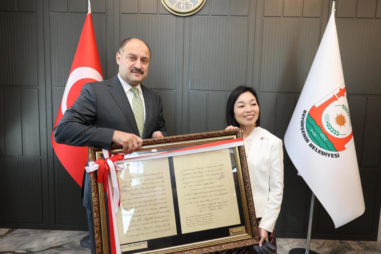 Başkan Gülpınar, Japon İmparatoru Mutsuhito’nun 10 Mayıs 1888 tarihinde Osmanlı Padişahı Sultan II. Abdülhamid’e gönderdiği mektubun replikasını Prenses Akiko’ya takdim ederek, iki ülke ortasındaki 137 yıllık diplomatik dostluğu simgeleyen manalı bir jestte bulundu.