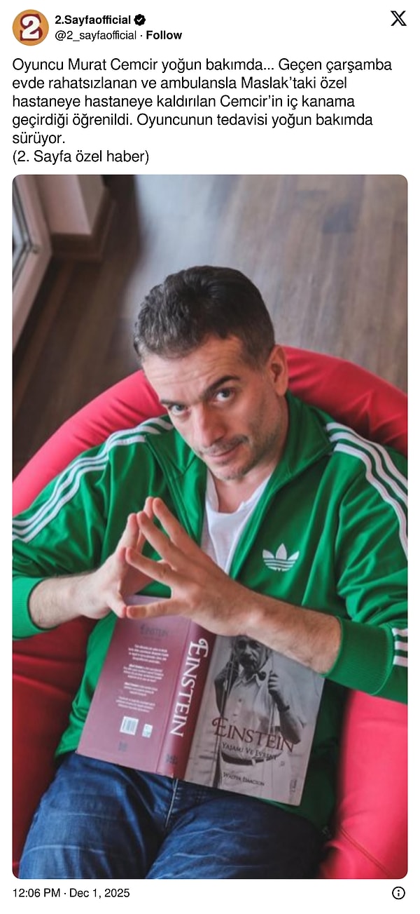 ‘Oyuncu Murat Cemcir ağır bakımda… Geçen çarşamba meskende rahatsızlanan ve ambulansla Maslak’taki özel hastaneye hastaneye kaldırılan Cemcir’in iç kanama geçirdiği öğrenildi. Oyuncunun tedavisi ağır bakımda sürüyor.’