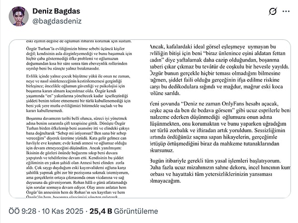 İlk etapta olaysız bir formda, oğulları Rohan’ı düşünerek ayrıldığını lisana getiren çift, sonrasında şiddet ve aldatma bahisleriyle gündeme gelmişti. Deniz Bağdaş’ın Özgür Turhan’ı aldattığı tez edilirken, Özgür Turhan’ın da Deniz Bağdaş’a şiddet uyguladığı öne sürülmüştü.