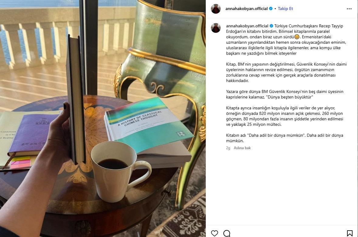 Paşinyan’ın eşi Anna Hakobyan, resmi instagram hesabından yaptığı paylaşımda Erdoğan’ın kitabını bitirdiğini söyledi ve kitaba ait değerlendirmelerde bulundu.