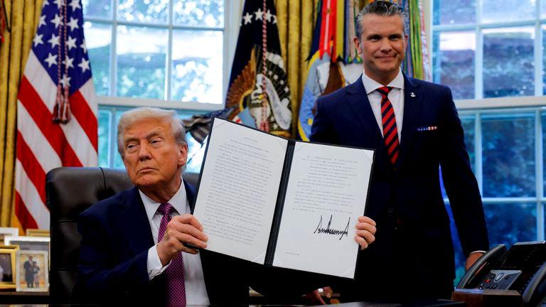 ABD Başkanı Donald Trump’ın dün kelam konusu kararnameyi imzalamasının akabinde Beyaz Saray’ın toplumsal medya hesabından bir paylaşım yapılmış, ABD Savunma Bakanı Pete Hegseth’in ofisinin kapısındaki isim tabelasının, kararnamede belirtildiği üzere “ABD Savaş Bakanı Pete Hegseth” yazılı bir tabelayla değiştirildiği gösterilmişti.