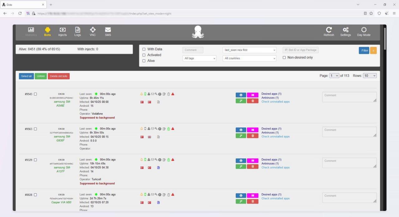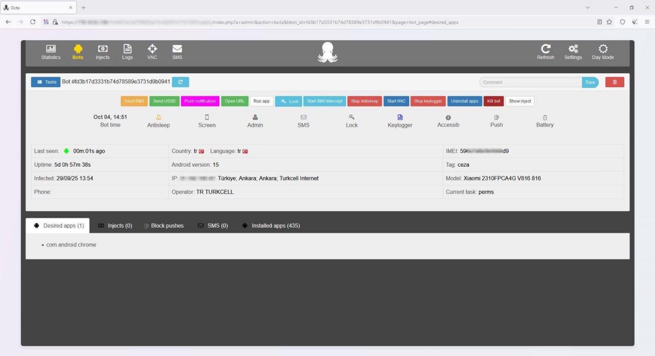 Operasyonda ayrıyeten, siber hata örgütünün taşınabilir telefonlara yüklediği ziyanlı yazılımları yönetmek hedefiyle kullandığı özel denetim paneli de ele geçirildi. Bu panel vasıtasıyla telefonların büsbütün denetim altına alındığı, kullanıcıların bilgisi dışında üçüncü bireylere SMS gönderilebildiği, gelen ve giden davetlerin yönlendirilebildiği, aygıtın kamerası ve ekranının uzaktan izlenebildiği ve anlık pozisyon bilgilerinin takip edilebildiği tespit edildi.