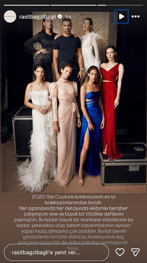 Bağzıbağlı, 2020 Yaz Couture koleksiyonunun mesleğinin en özel işlerinden biri olduğunu hatırlatırken; her kesiminin grubuyla birlikte büyük emek ve titizlikle hazırlandığını vurguladı. Akabinde “Bu kadar büyük bir markanın stilistlerinin bu kadar yeteneksiz olup, benim tasarımlarımın birebirini yapıp maaş almasına çok üzüldüm.” dedi. Hatta gördüklerinin sırf kendi fark edebildikleri olduğunu, kim bilir koleksiyondan daha kaç kesimin kopyalanıp, bir de daha değerliye satılmış olabileceğini söyledi.