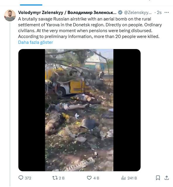 “Donetsk bölgesindeki Yarova köyüne, hava bombasıyla acımasız ve yırtıcı bir Rus hava saldırısı düzenlendi. Taarruz, emekli maaşlarının yattığı gün sıradan sivil vatandaşlara yönelik gerçekleşti. Birinci bilgilere nazaran 20’den fazla kişi hayatını kaybetti. Söylenecek kelam yok. Kurbanların tüm ailelerine ve sevdiklerine başsağlığı diliyorum. Rusya’nın bu cins hücumları dünya tarafından uygun bir reaksiyonla karşılanmalıdır. Ruslar, daha güçlü yaptırımlardan kaçınarak hayatları yok etmeye devam ediyor. Dünya sessiz kalmamalı. Dünya hareketsiz kalmamalı. ABD ve AB reaksiyon göstermeli. Rusya’nın getirdiği vefatları durdurmak için güçlü tedbirler alınmalı.”