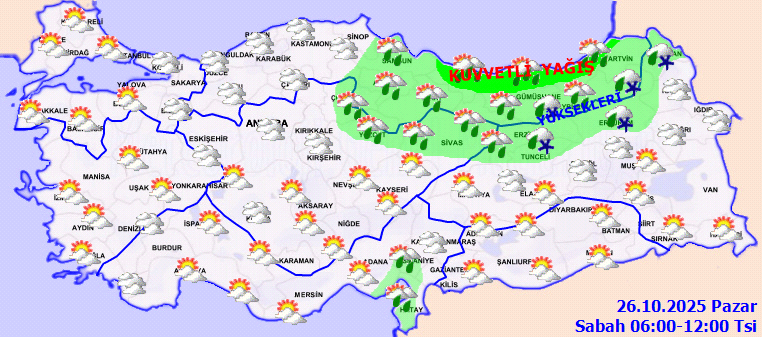 Parçalı ve az bulutlu, kuzeydoğusunun yer yer çok bulutlu, Sivas etraflarının lokal olmak üzere sağanak ve gök gürültülü sağanak yağışlı geçeceği kestirim ediliyor.