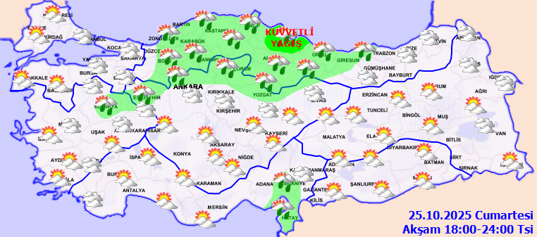 Yağışların, Doğu Karadeniz kıyıları ile Ordu çevrelerinde yer yer kuvvetli olması bekleniyor. Sel, su baskını, yıldırım, mahallî küçük çaplı dolu ve yağış anında kuvvetli rüzgar gibi aksiliklere karşı uyarı yapıldı.