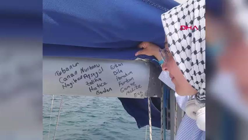 Önceki günlerde yaşadıkları dron saldırısını anlatan Yaman, “Bir dron, isimleri yazdığım noktada, yani ana yelken direğimizin yanında patladı. Yelkenimiz paramparça oldu fakat isimler hala duruyor. İnşallah bizimle birlikte Gazze’ye kadar da gidecekler” diye konuştu.