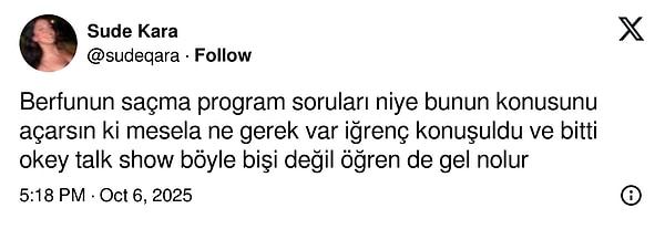 X kullanıcıları ise bu mevzuyu programda açan Berfu Yenenler’e reaksiyon gösterdi: