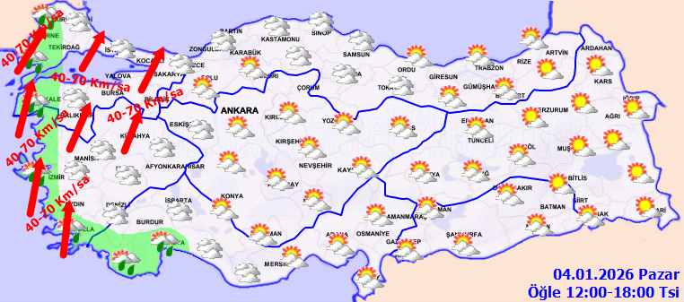 Rüzgarın; Doğu Anadolu’nun doğusunda kuvvetli (30-50 km/sa), Doğu Karadeniz kıyılarında kuzey ve kuzeybatı taraflardan çok kuvvetli ve fırtına (50-80 km/saat) şeklinde esmesi bekleniyor. Yaşanabilecek çatı uçması, ağaç devrilmesi, ulaşımda aksamalar üzere aksiliklere karşı vatandaşlara ikaz yapıldı.